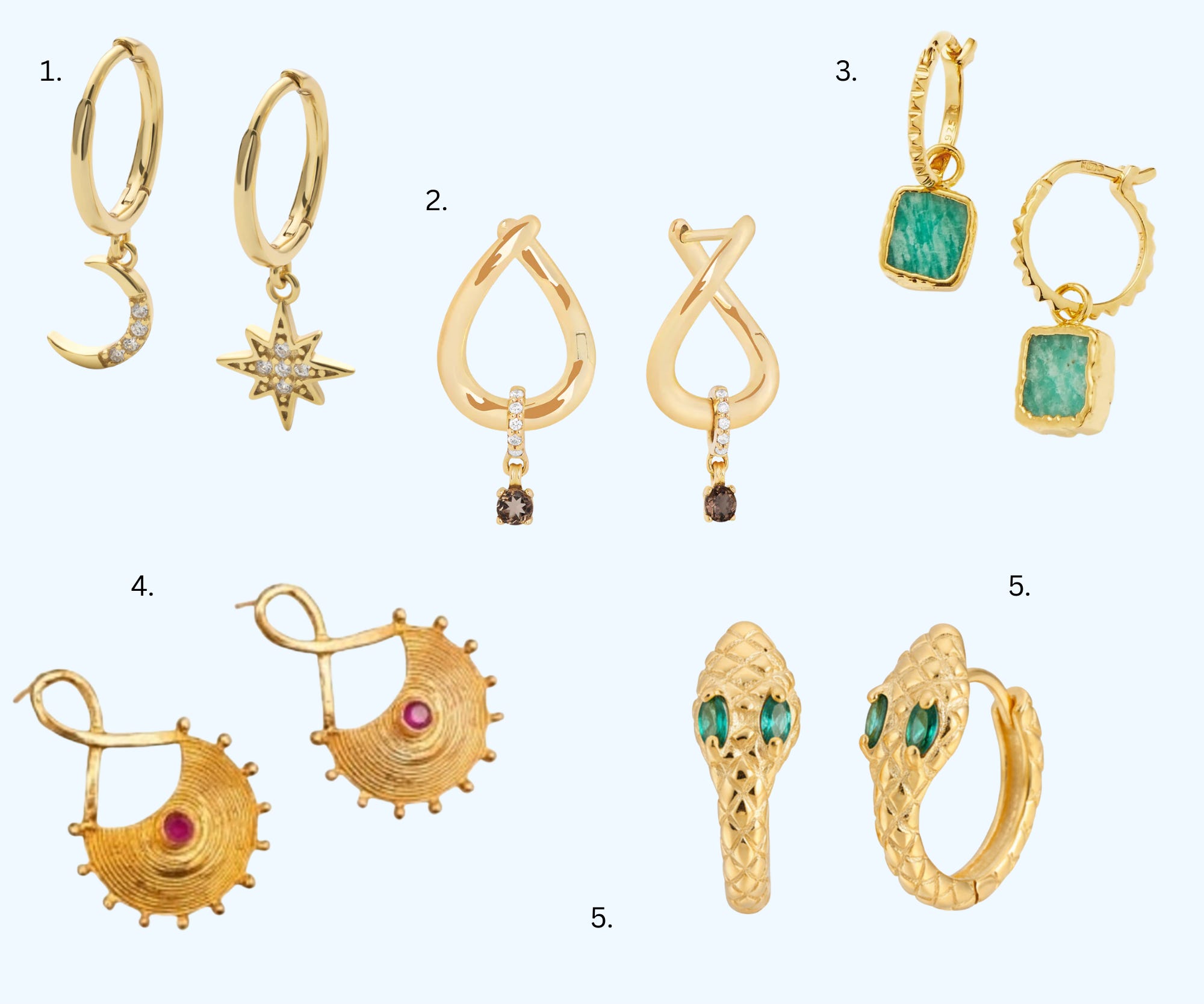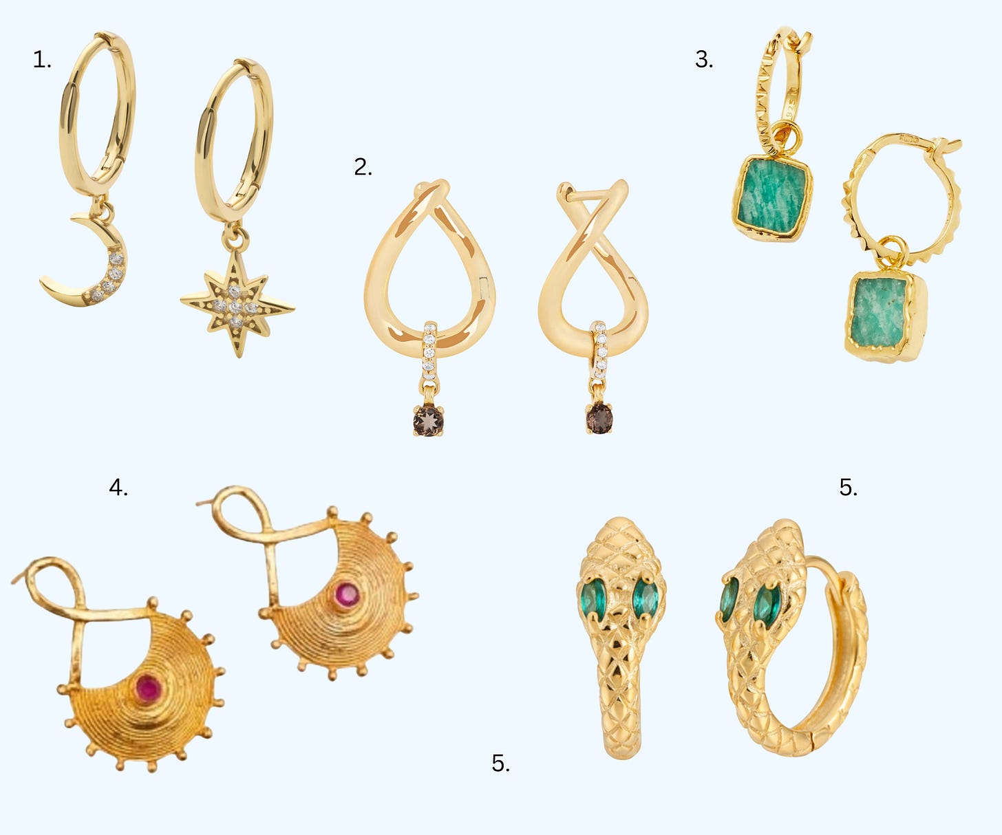 I always love a gold hoop. Hoop earrings are one of the oldest jewellery designs in human history. Variations of gold hoops have been worn in ancient cultures across the Mediterranean, Africa, and the Middle East. When I go to the Metropolitan Museum in New York or the British Museum in London, it is the gold hoops and rings I lust after; they always look as if they were made yesterday they are so chic and modern, and yet they are thousands and thousands of years old. In the summer I love a gold hoop with a stone to become a bit more bohemian and glamorous, and always a nod to the style vibes of Cleopatra.
